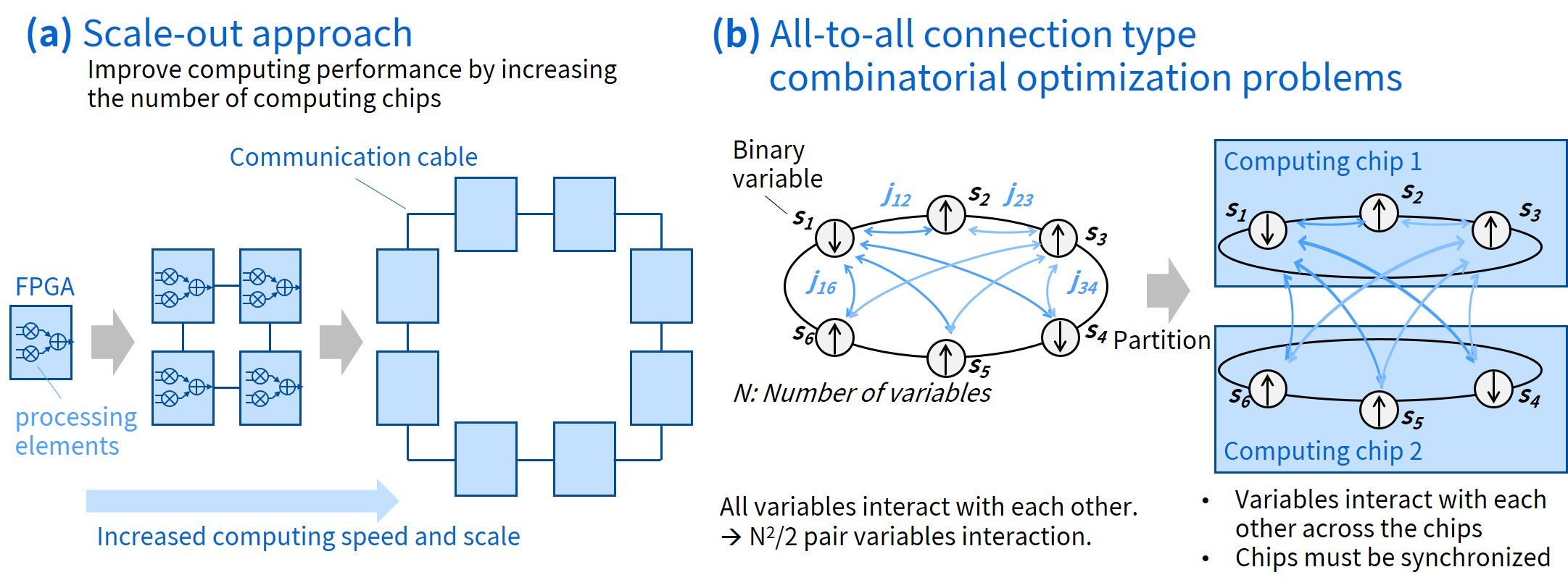 Figure 1: (a) Scale-out approach: improve computing performance by increasing the numbers of computing chips; (b) All-to-all connection type combinatorial optimization problems: all variables interact with each other.