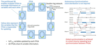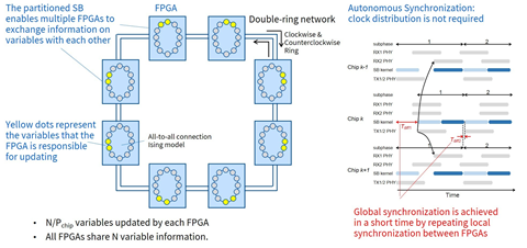 Toshiba continues to pursue better performance of the SBM by installing more FPGAs in the computer, an approach called scale-out in computer architecture, and has successfully demonstrated the world’s first*4 simultaneous scale-out of computing speed and problem size for all-to-all connection type combinatorial optimization problems*1. At the heart of the technology is a partitioned version of the simulated bifurcation algorithm that enables multiple FPGAs to exchange information on variables with each other, and that triggers an autonomous synchronization mechanism in minimizing the communications overhead to an extent that does not affect overall performance (Figures 1 & 2).