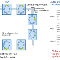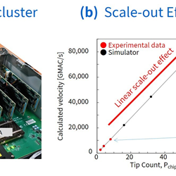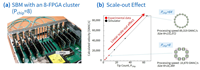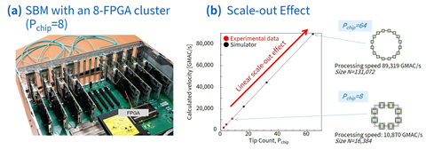 Trials has shown that an SBM with a cluster of eight FPGA (Figure 3a) achieves computational throughput 5.4 times higher than an SBM with single FPGA, and solve problems 16 times larger; and simulation results with a 64 FPGA SBM have demonstrated that the relationship between the computing speed and number of FPGA is exactly linear (Figure 3b), indicating that the technology can continue to increase the scale-out with the same effect.