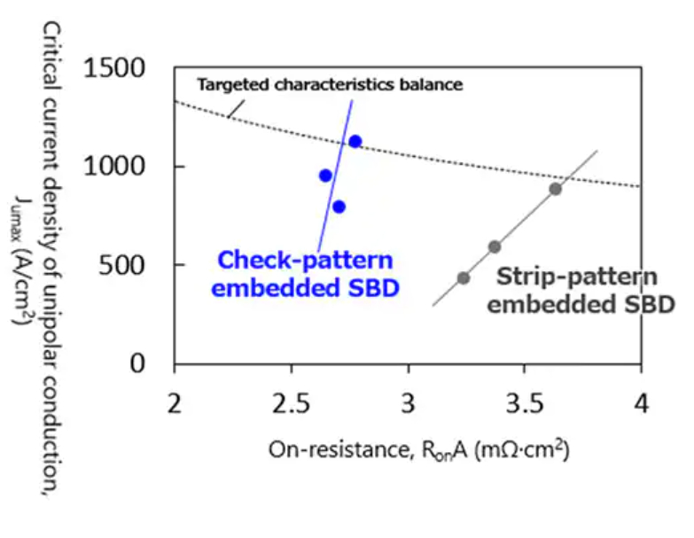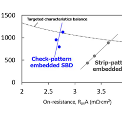 Toshiba has improved both conduction loss in its SBD-embedded SiC MOSFET, and achieved good diode conductivity, by deploying a check-pattern SBD distribution. Evaluation of the on-side current characteristics of 1.2kV-class-SBD-embedded MOSFETs with the optimized design confirmed that using the check design to position the embedded-SBDs close to the body diodes effectively limits bipolar conduction of the parasitic diodes, while the unipolar current limit of reverse conduction is double that realized by the current striped SBD pattern design for the same SBD area consumption. RonA was found to be approximately 20% lower, at 2.7mΩ・cm2.