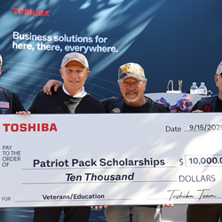 Amid a sea of red, white and blue shirt-clad and Stars & Stripes-waving Toshiba staff, Toshiba America Business Solutions President and Chief Executive Officer Larry White presented Patriot Pack Founder and U.S. Navy veteran Mike Stramaglio a $10,000 check to help fund scholarships for U.S. military veterans.